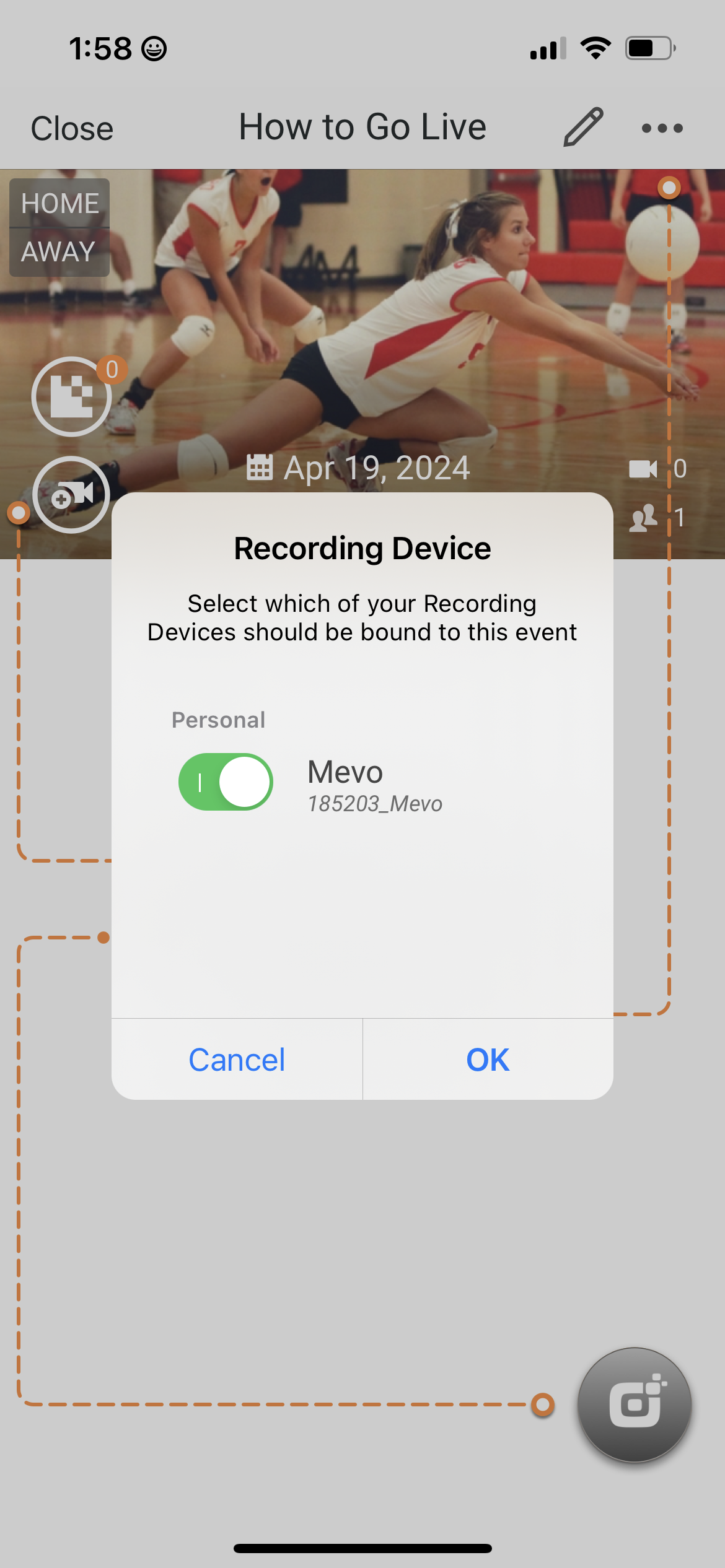 Finally, in the Sporfie App, create an event, then enter the event by tapping on its card and tap on the button “Add Stream” (the one above the Camera icon) to enable your device ID.