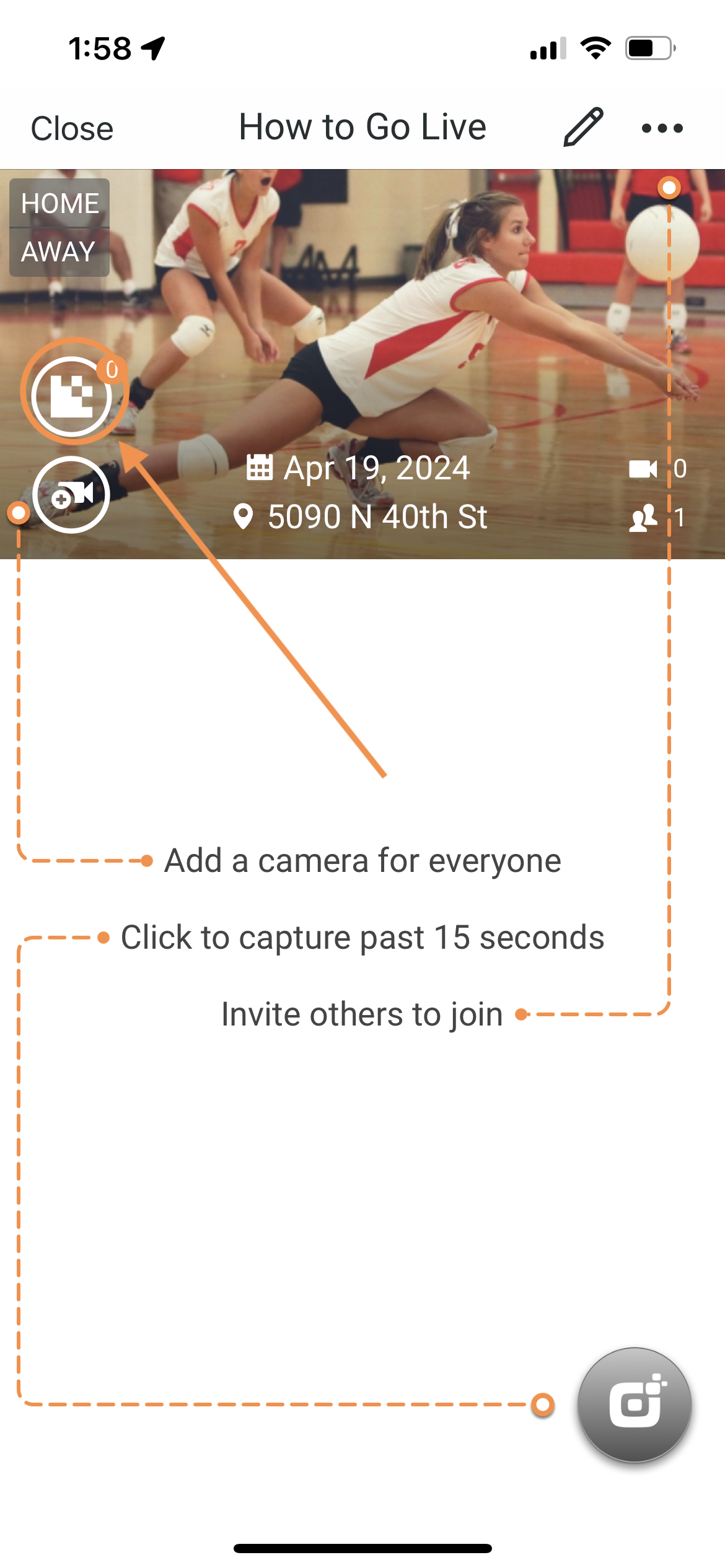 Using a GoPro Hero 7 Black or later, you can stream to the Sporfie cloud and have your GoPro appear as a camera inside your event. From the Sporfie mobile app or web app, you will then be able to capture highlights, watch the live stream and have the full recording of the game saved in the cloud for future access.